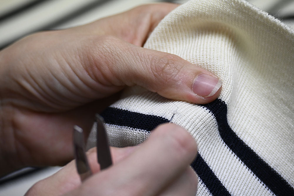The sweater then passes throughQuality Control. In the event of a defect, however small, the garment is sent to the mending workshop / raccoutrage, where the necessary alterations are carried out. The buttons and buttonholes are placed, the sweater is ironed and, finally, put in a bag. It is now ready to ship.