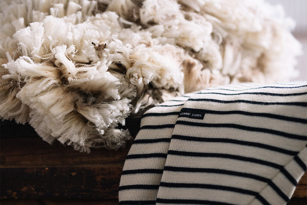 In 2020, Saint James joined the French Tricolore collective. This organization aims to promote and rebuild the French wool industry, ranging from sheep shearing to knitting, including the various stages of washing, carding, combing, and spinning. Two styles, a men's sailor sweater, and a women's Breton sweater, were launched to celebrate this initiative with the SS21 Collection.